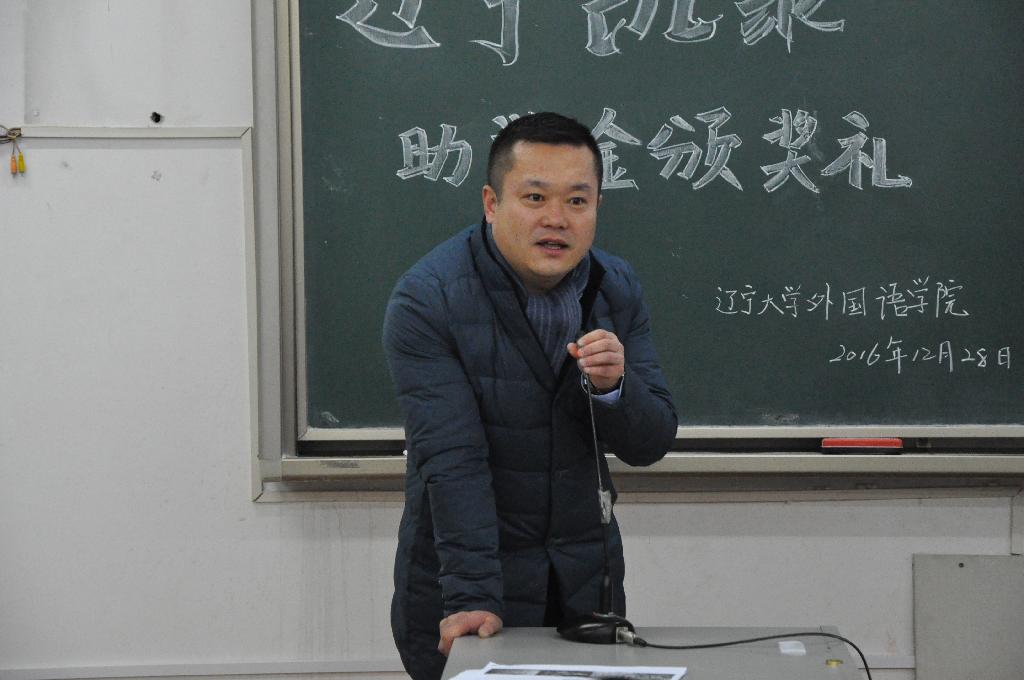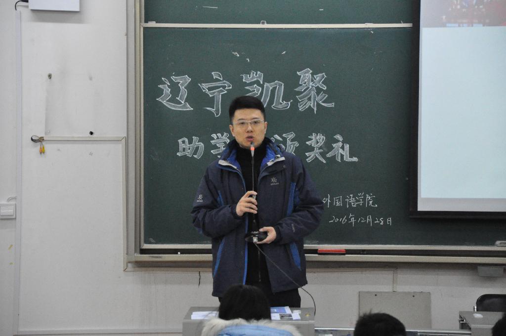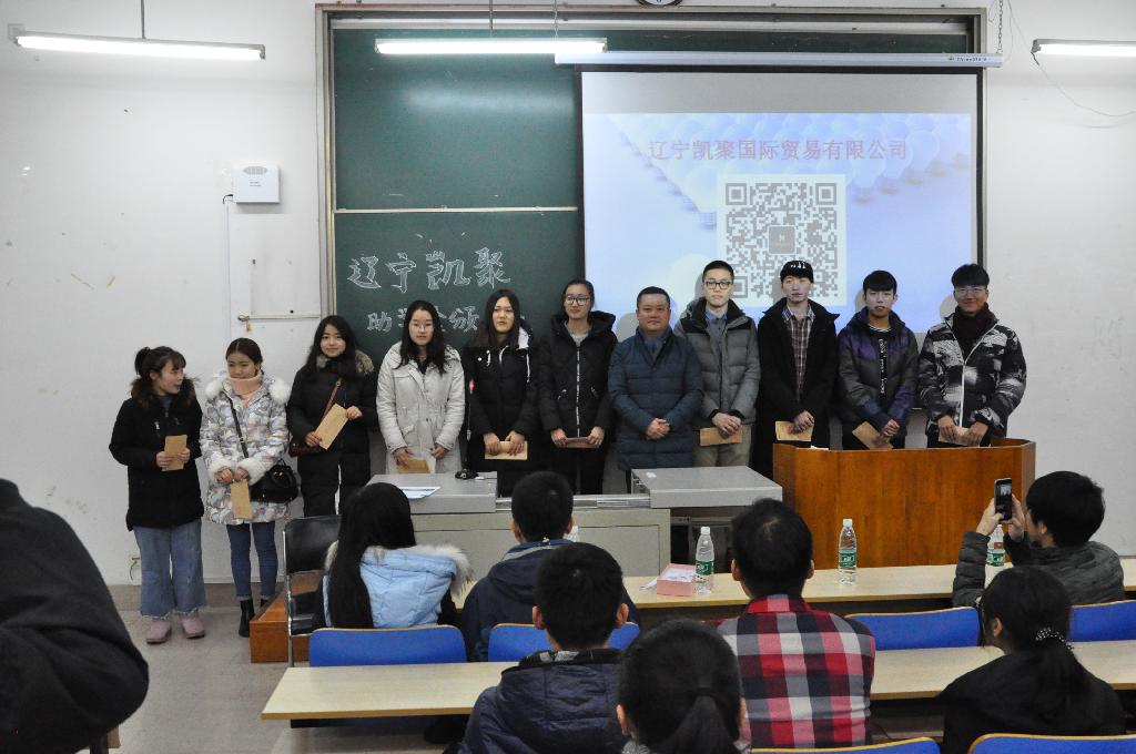 2016年12月28日晚,外国语学院“辽宁凯聚助学金”颁奖礼在博雅楼101教室举行。辽宁凯聚国际贸易有限公司总经理金熙东、销售总监梁丽萍、外国语学院党委副书记兼副院长李海波、本科辅导员张晶晶以及外国语学院130余名同学参加了此次活动。