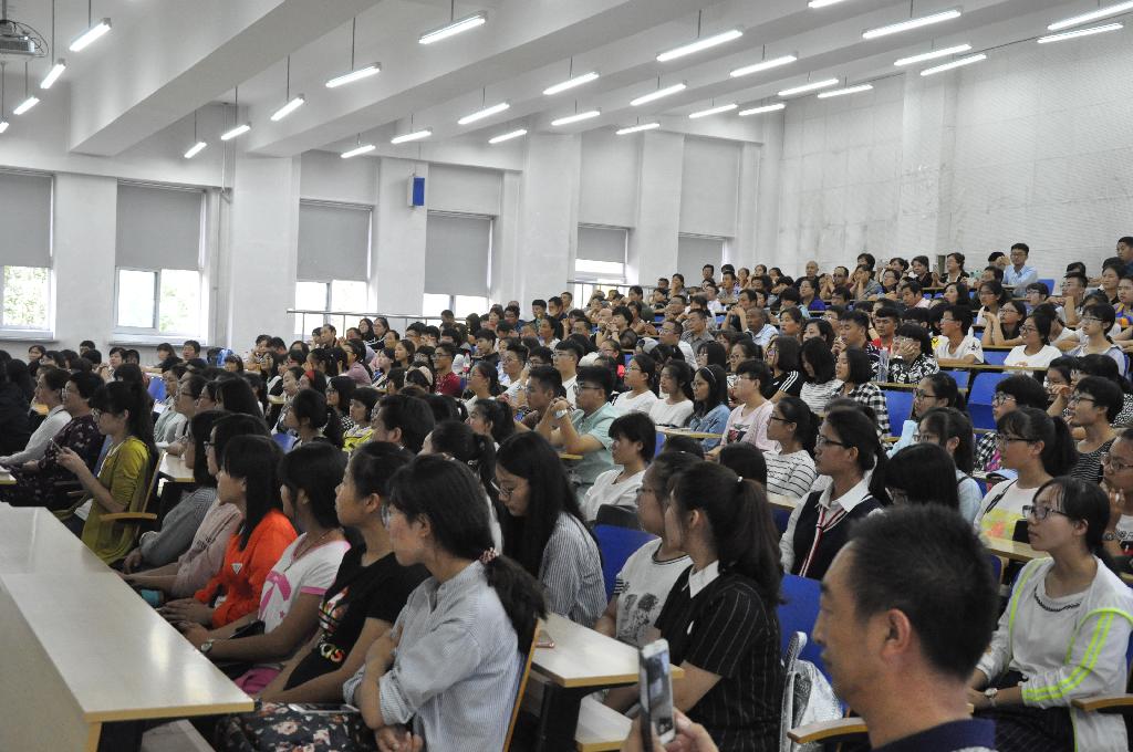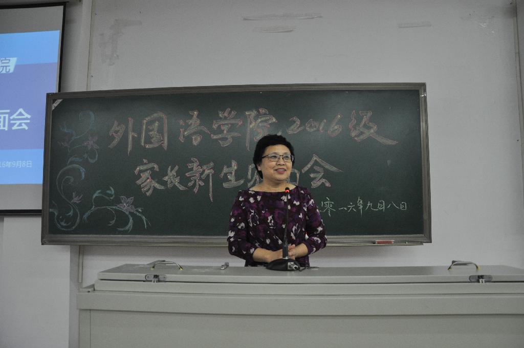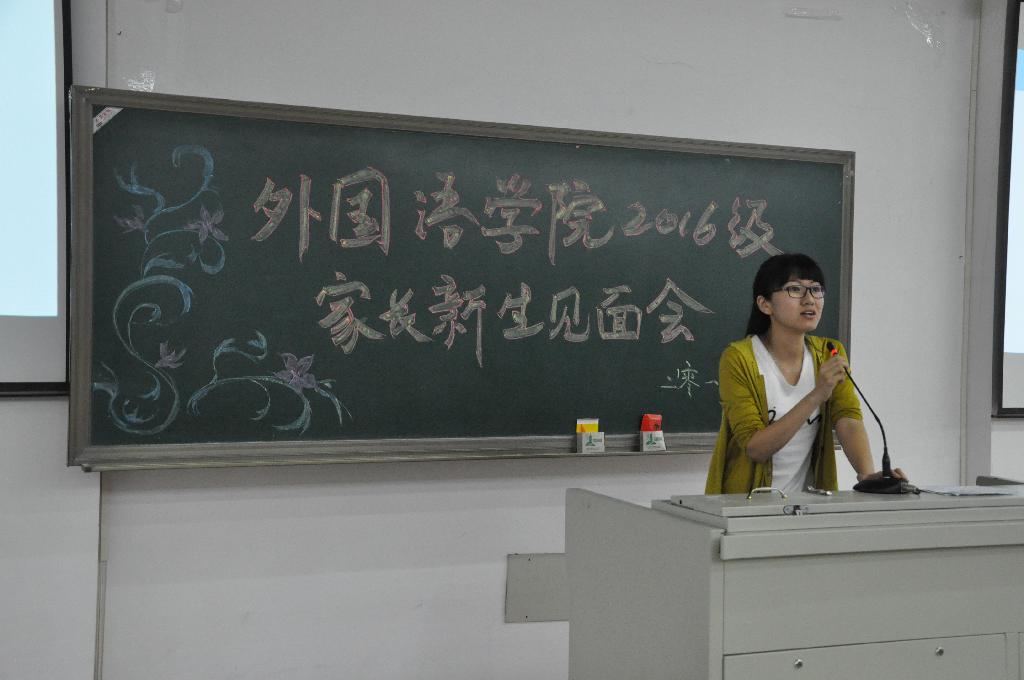 2016年9月8日下午,外国语学院2016级新生入学指导暨家长见面会在方圆楼201教室举行。外国语学院院长周洁教授、党委副书记兼副院长李海波、团委书记赵跃、本科辅导员王晗、崔振宇参加了本次见面会,到会的学生和家长总数达到400人。